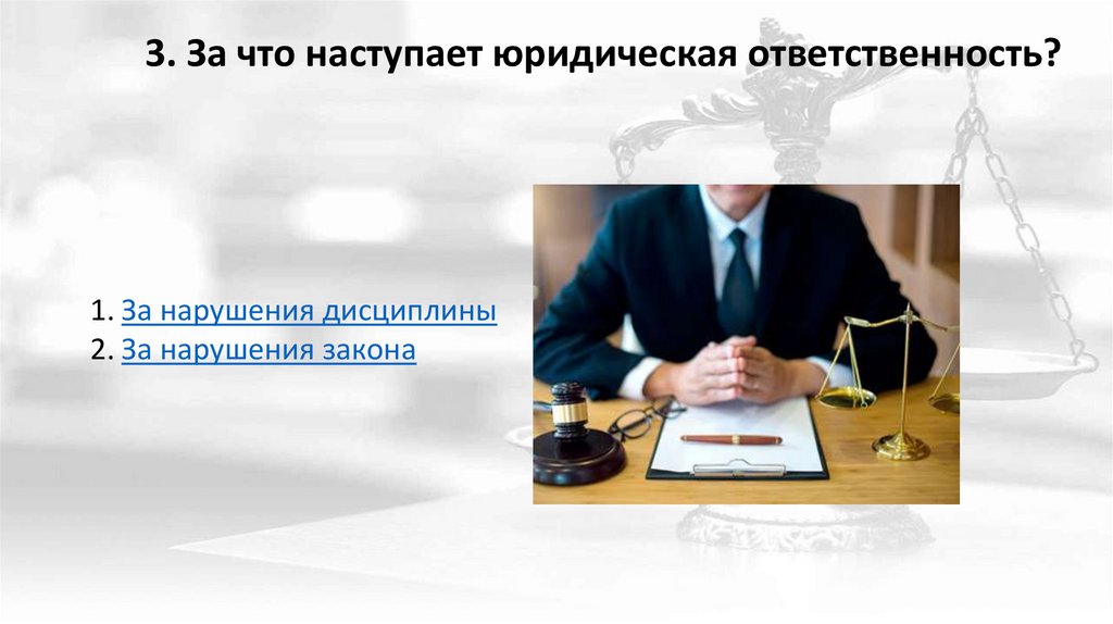 3. За что наступает юридическая ответственность?1. За нарушения дисциплины
