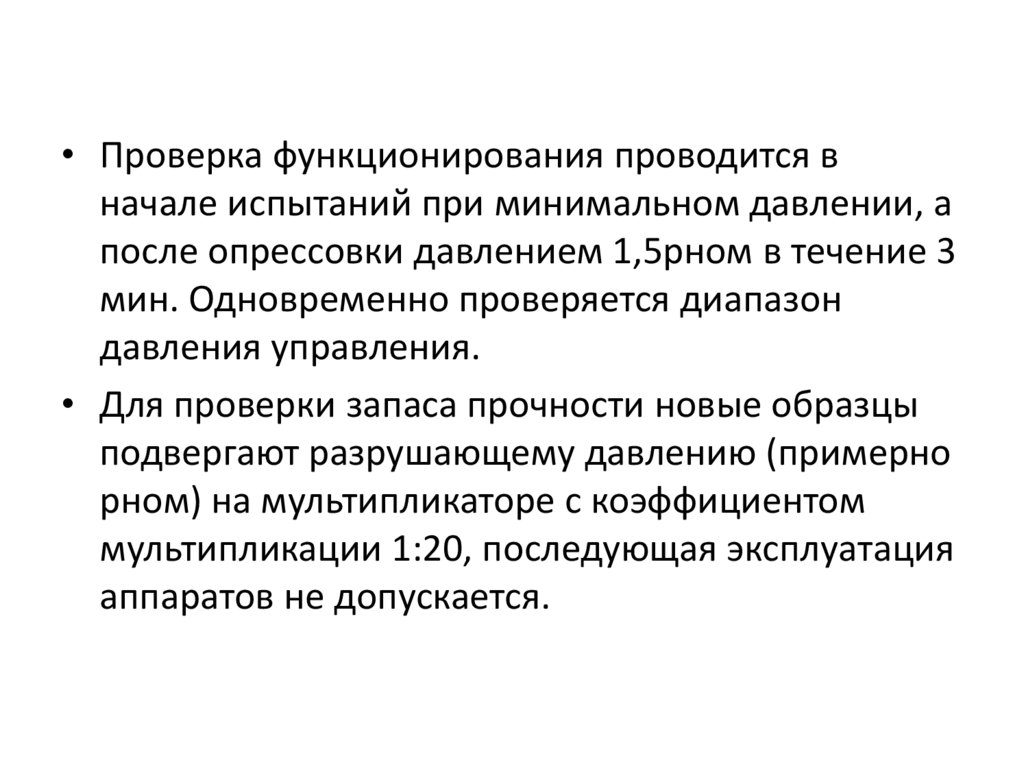 • Проверка функционирования проводится вначале испытаний при минимальном давлении, а