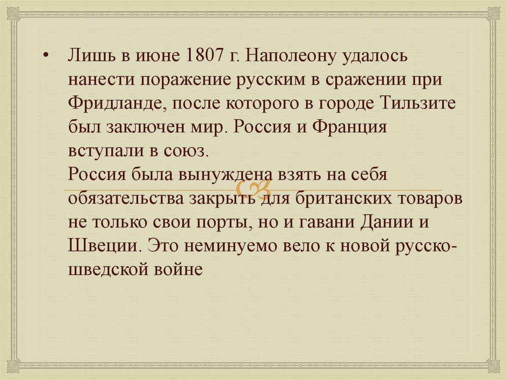 • Лишь в июне 1807 г. Наполеону удалосьнанести поражение русским в сражении при