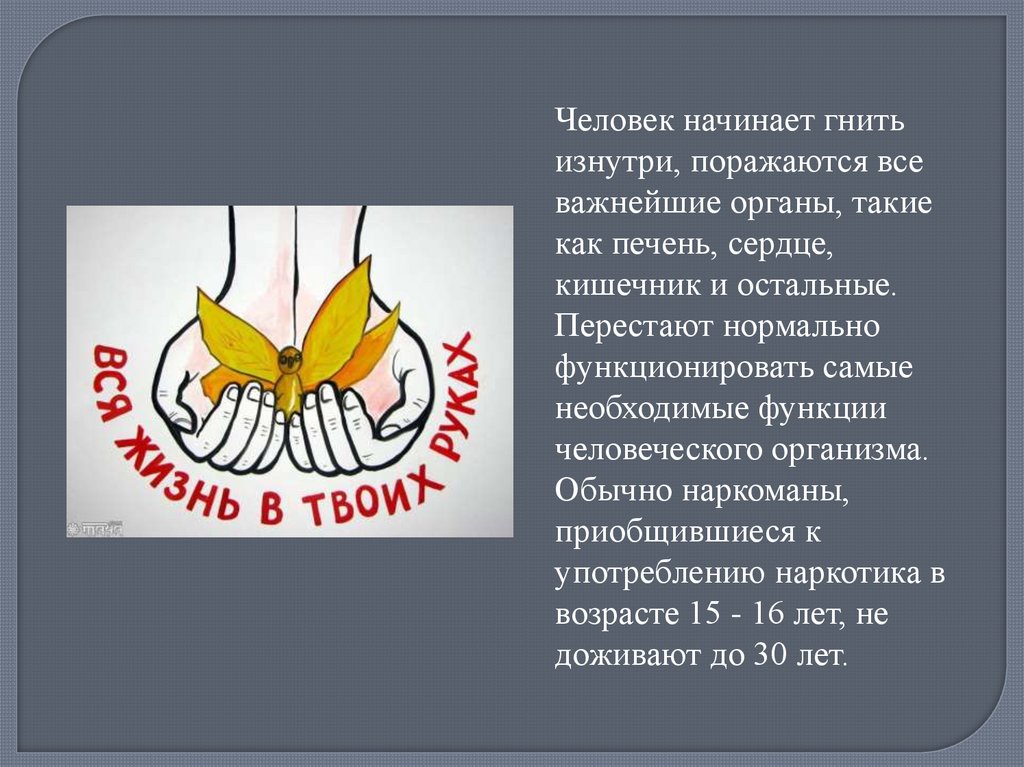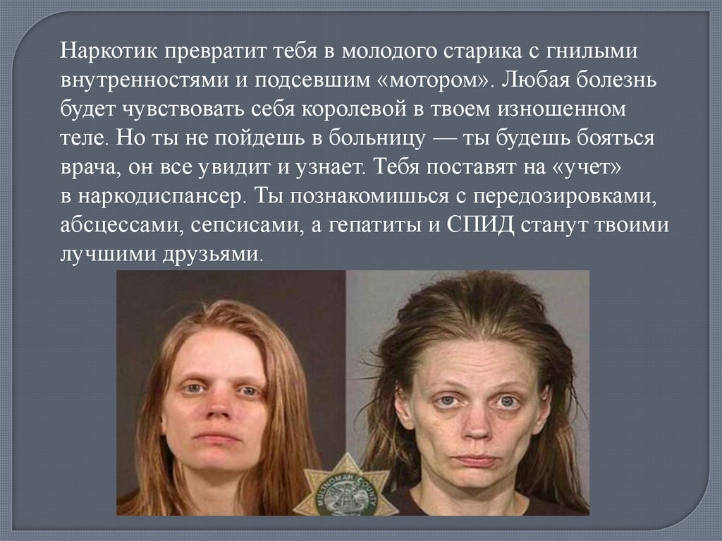 Наркотик превратит тебя в молодого старика с гнилымивнутренностями и подсевшим «мотором». Любая болезнь
