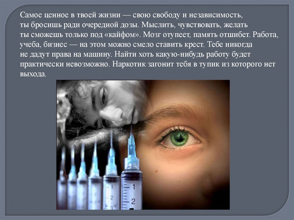Самое ценное в твоей жизни — свою свободу и независимость,ты бросишь ради очередной дозы. Мыслить, чувствовать, желать