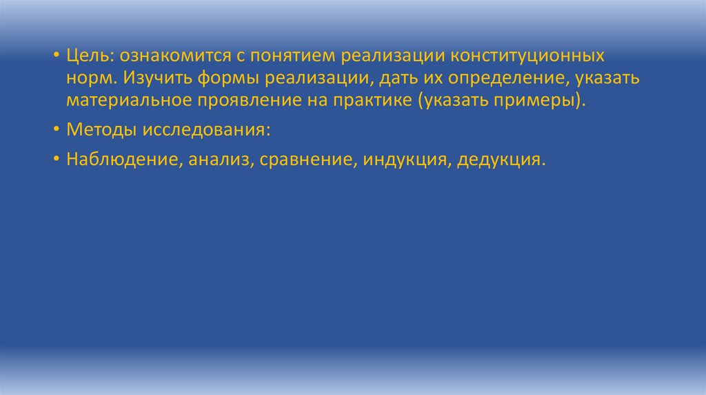 • Цель: ознакомится с понятием реализации конституционныхнорм. Изучить формы реализации, дать их определение, указать