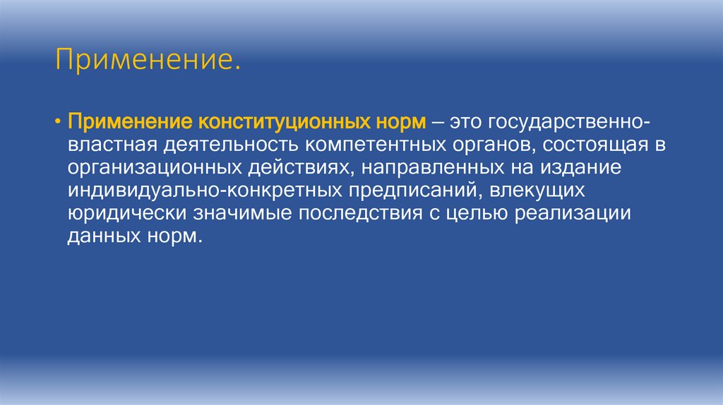 Применение.• Применение конституционных норм — это государственновластная деятельность компетентных органов, состоящая в