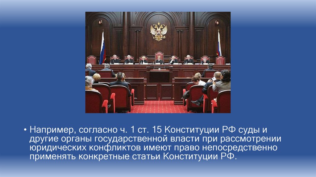 • Например, согласно ч. 1 ст. 15 Конституции РФ суды идругие органы государственной власти при рассмотрении