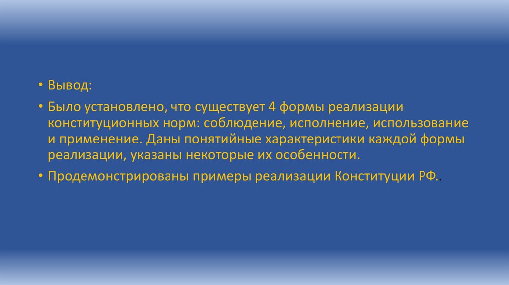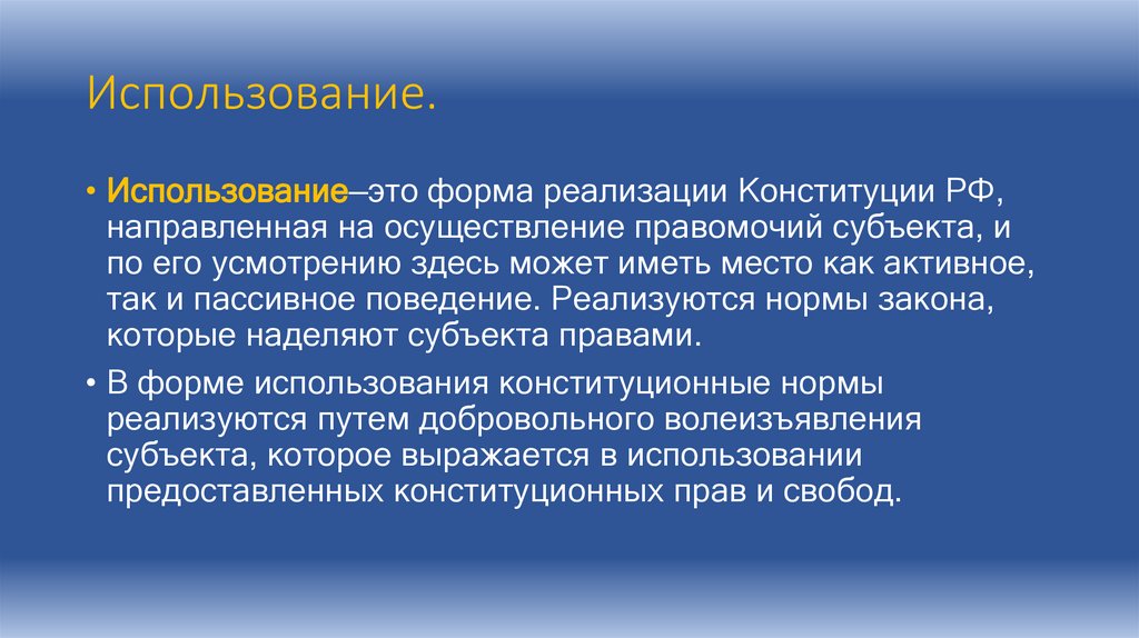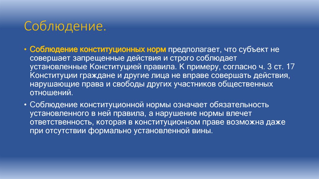 Соблюдение.• Соблюдение конституционных норм предполагает, что субъект не