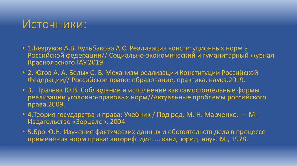 Источники:• 1.Безруков А.В. Кульбакова А.С. Реализация конституционных норм в