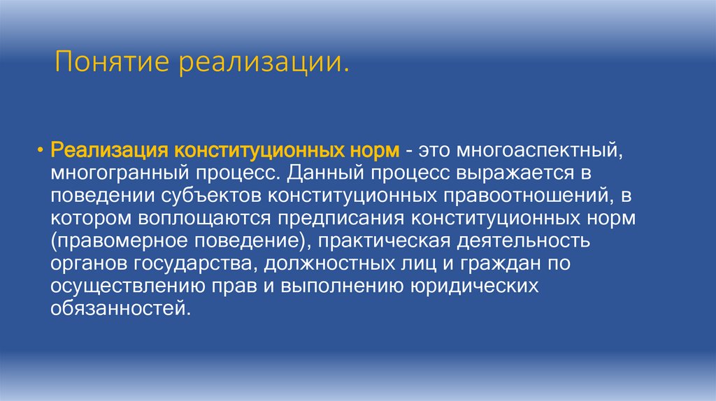 Понятие реализации.• Реализация конституционных норм - это многоаспектный,