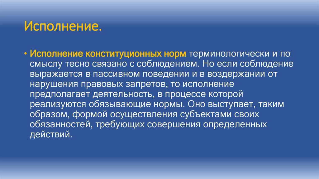 Исполнение.• Исполнение конституционных норм терминологически и по