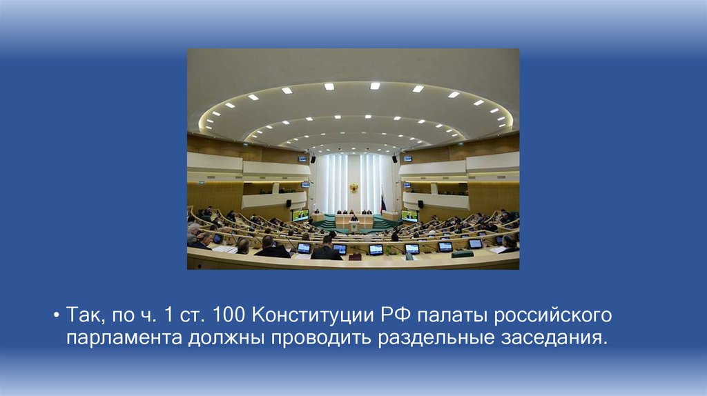 • Так, по ч. 1 ст. 100 Конституции РФ палаты российскогопарламента должны проводить раздельные заседания.