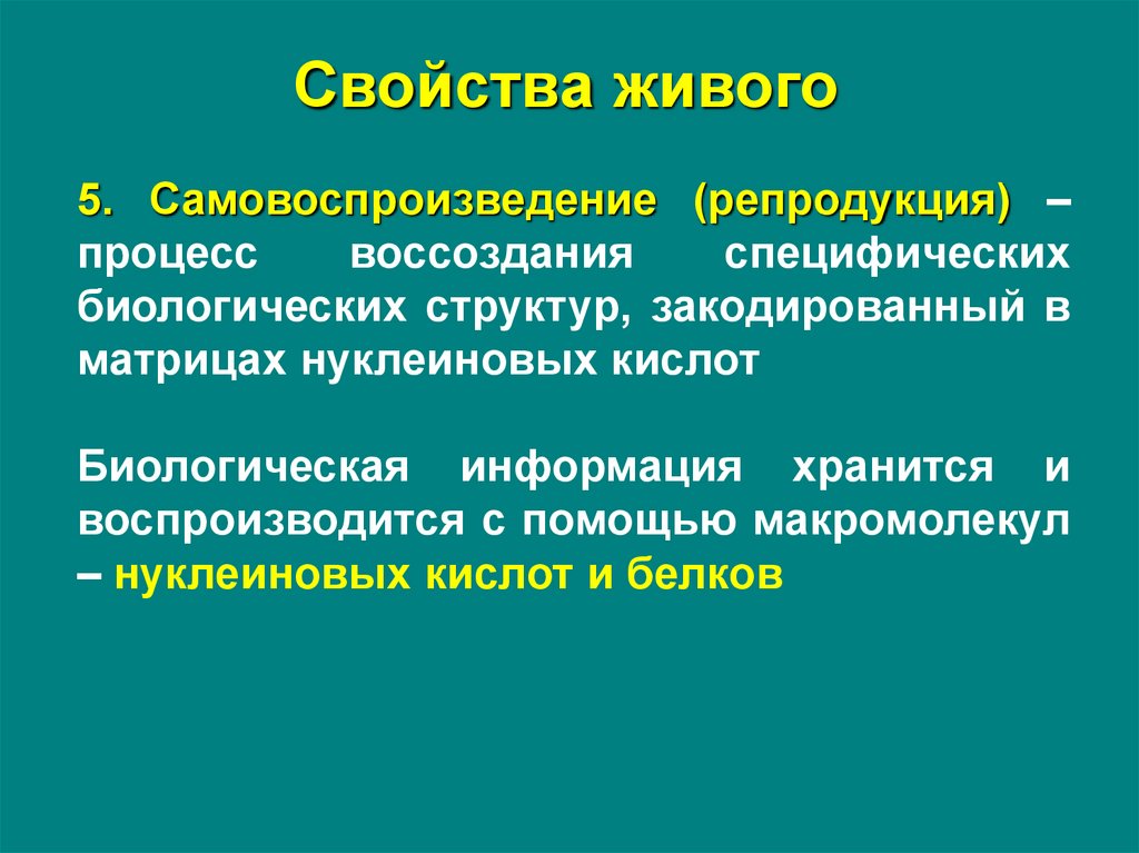 Свойства живого5. Самовоспроизведение (репродукция) –