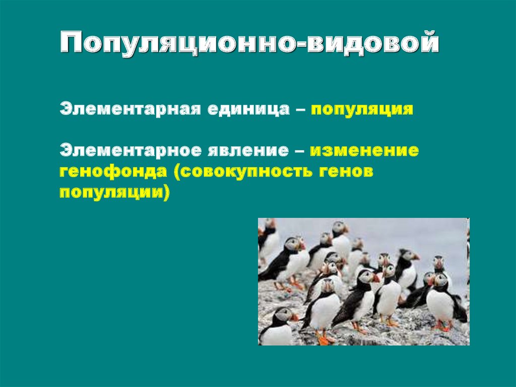 Популяционно-видовойЭлементарная единица – популяция