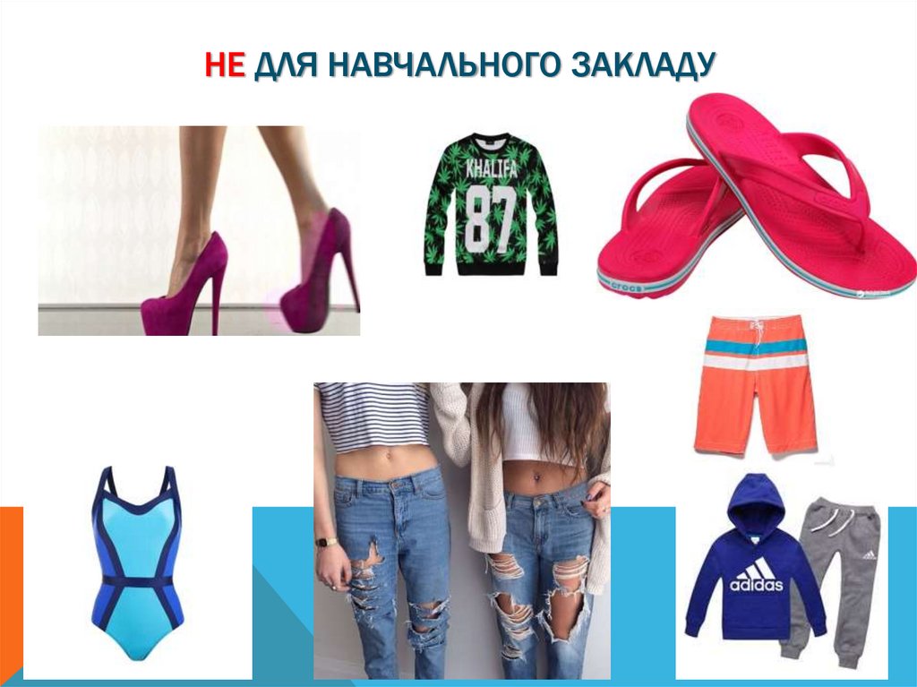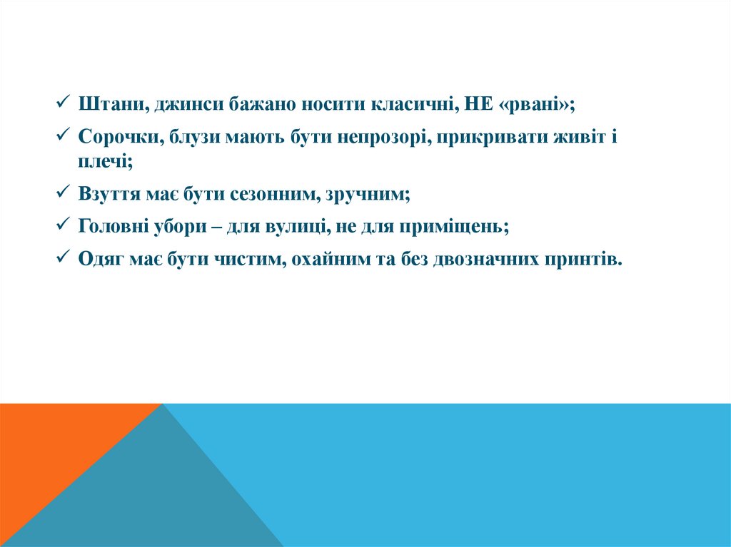 Штани, джинси бажано носити класичні, НЕ «рвані»;Сорочки, блузи мають бути непрозорі, прикривати живіт і