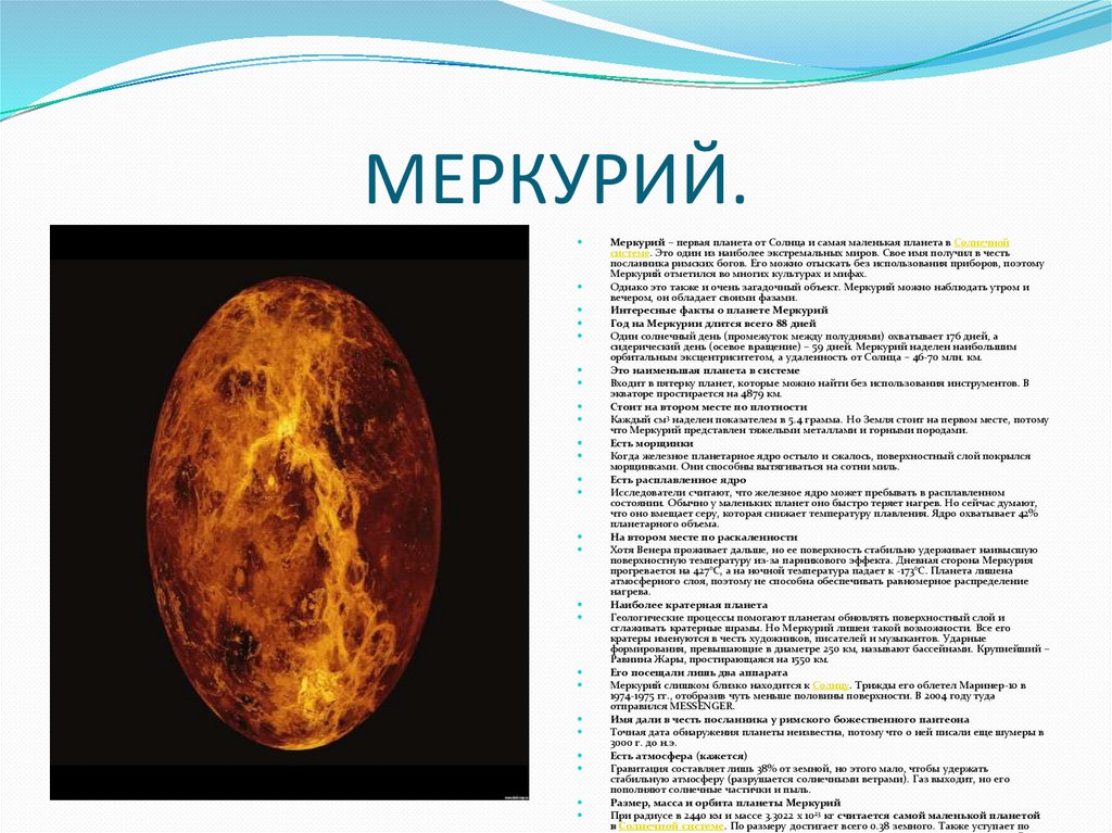 МЕРКУРИЙ.Меркурий – первая планета от Солнца и самая маленькая планета в Солнечной