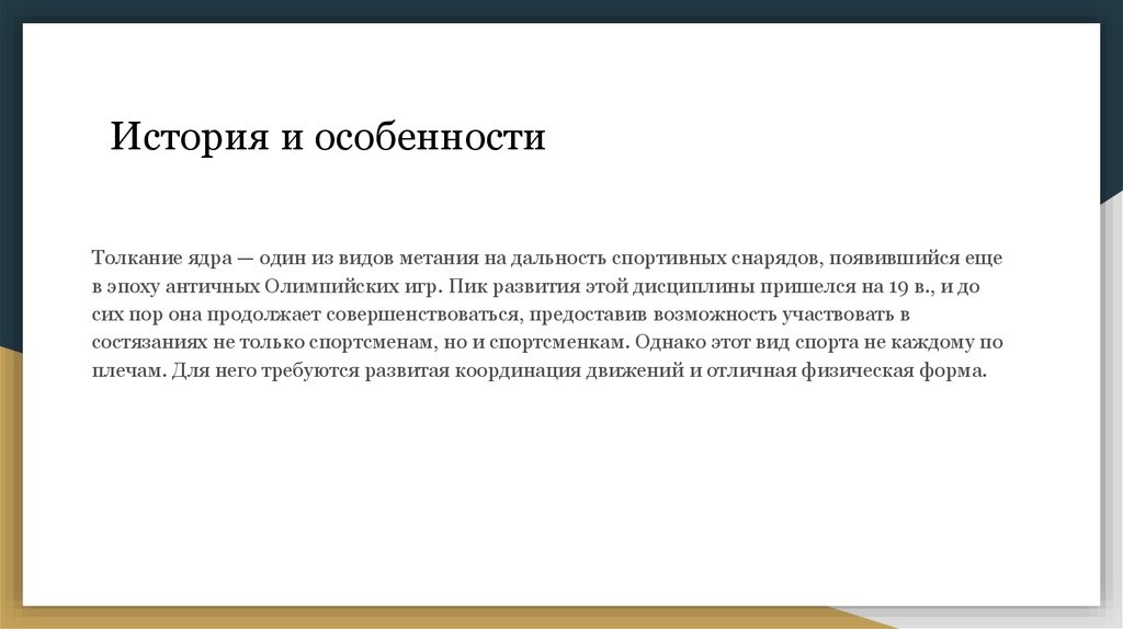 История и особенностиТолкание ядра — один из видов метания на дальность спортивных снарядов, появившийся еще