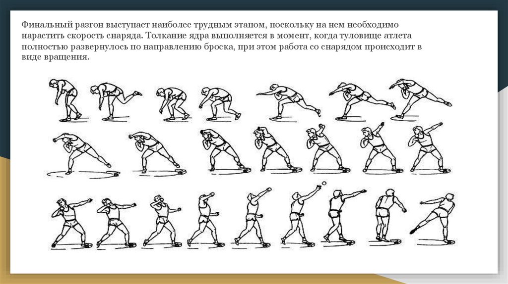 Финальный разгон выступает наиболее трудным этапом, поскольку на нем необходимонарастить скорость снаряда. Толкание ядра выполняется в момент, когда туловище атлета