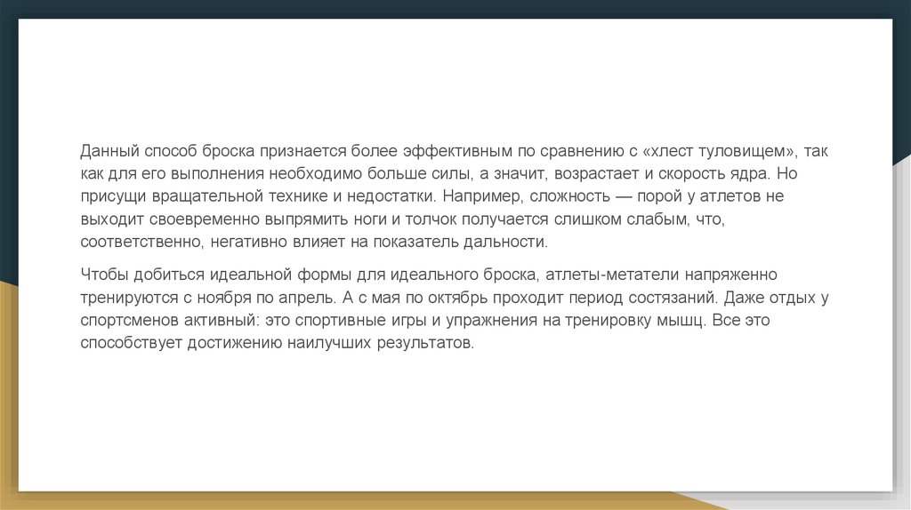 Данный способ броска признается более эффективным по сравнению с «хлест туловищем», таккак для его выполнения необходимо больше силы, а значит, возрастает и скорость ядра. Но