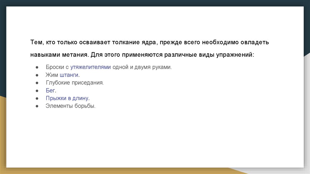 Тем, кто только осваивает толкание ядра, прежде всего необходимо овладетьнавыками метания. Для этого применяются различные виды упражнений: