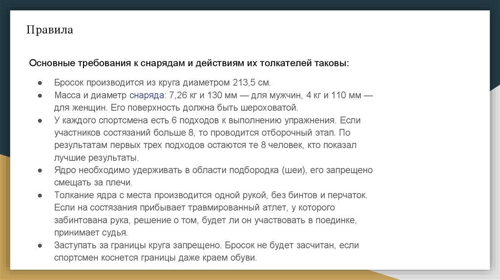 Масса и диаметр снаряда: 7,26 кг и 130 мм — для мужчин, 4 кг и 110 мм —
