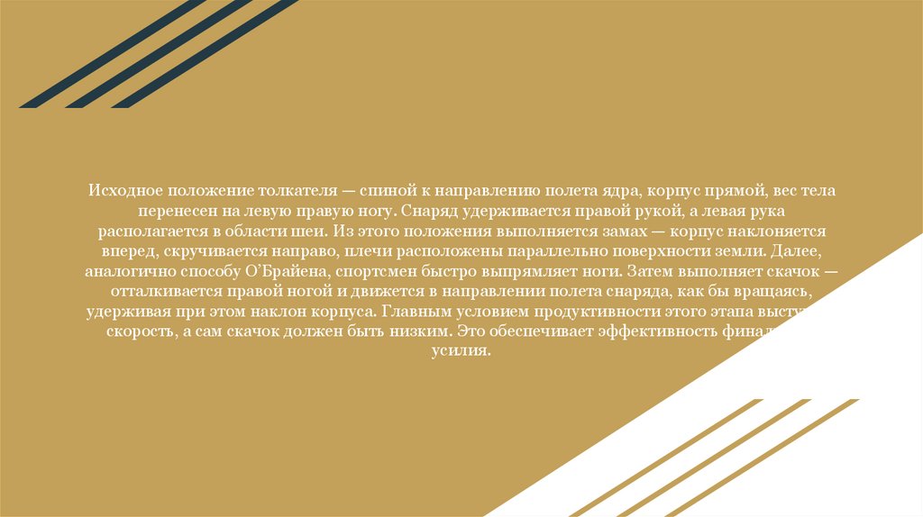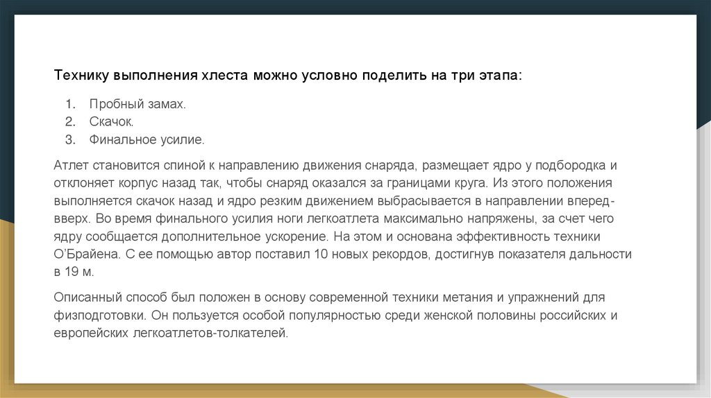 Описанный способ был положен в основу современной техники метания и упражнений для