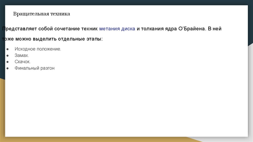 Вращательная техникаПредставляет собой сочетание техник метания диска и толкания ядра О’Брайена. В ней