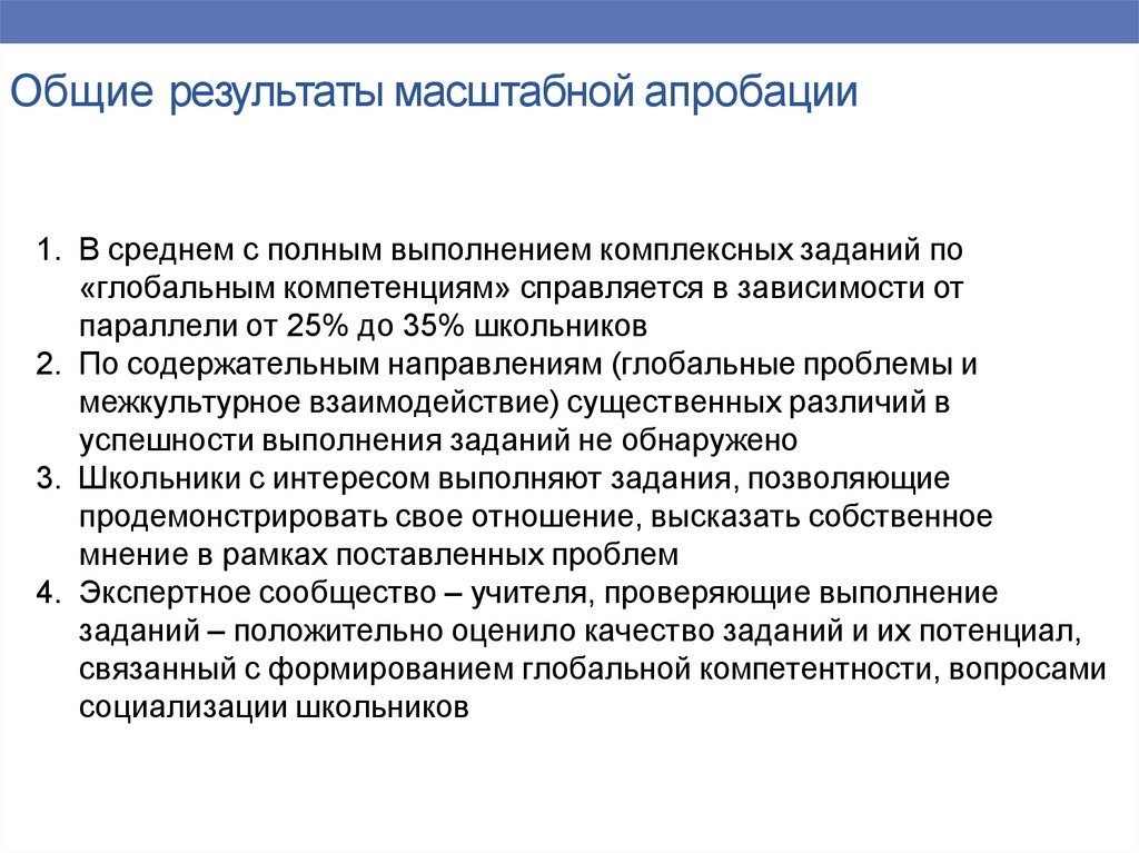 Общие результаты масштабной апробации1. В среднем с полным выполнением комплексных заданий по