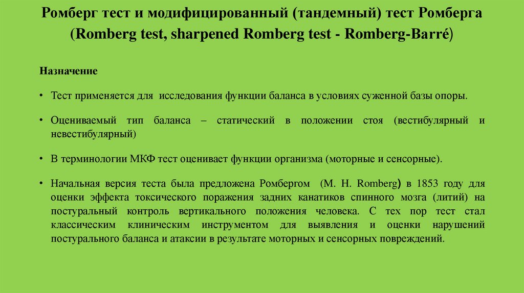 • Начальная версия теста была предложена Ромбергом (M. H. Romberg) в 1853 году для