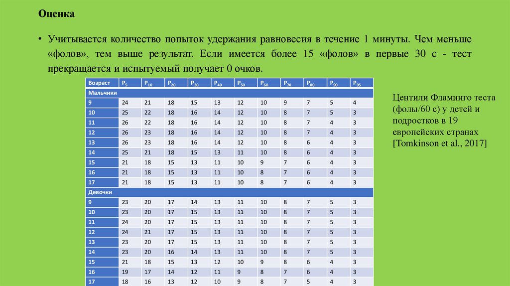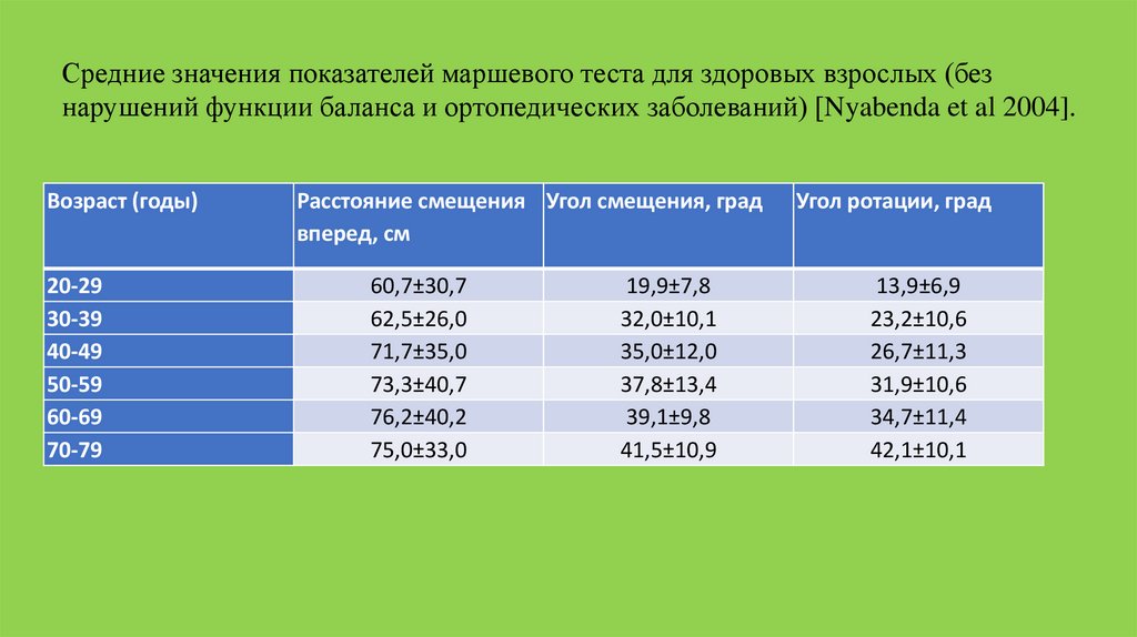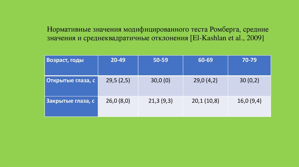 Нормативные значения модифицированного теста Ромберга, средниезначения и среднеквадратичные отклонения [El-Kashlan et al., 2009]