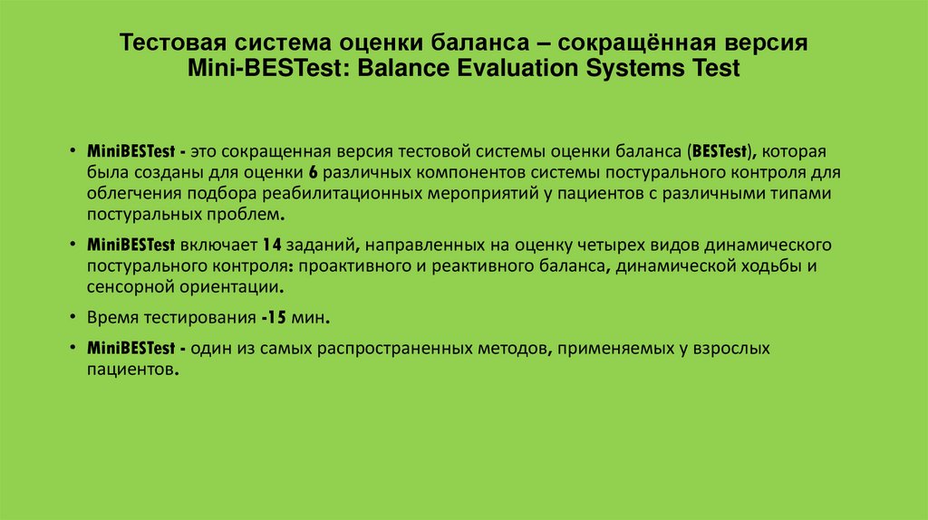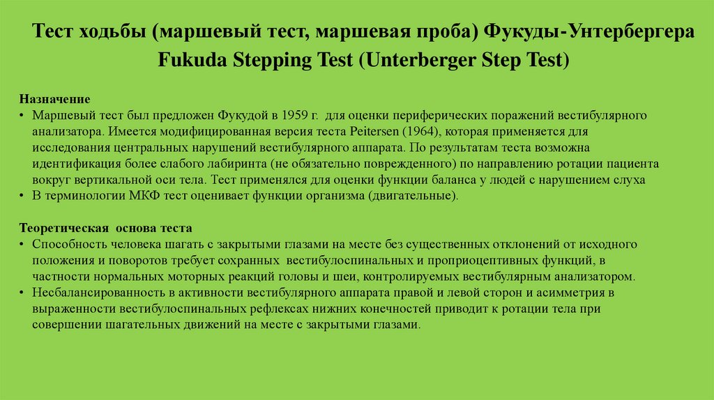 • В терминологии МКФ тест оценивает функции организма (моторные и сенсорные).