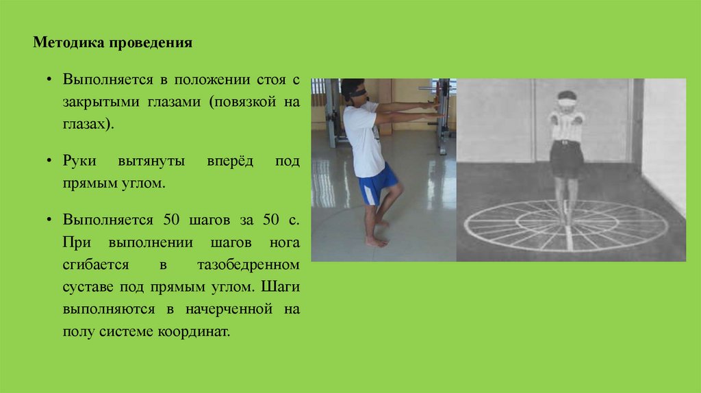 балансировки с закрытыми глазами, открывает глаза, теряет равновесие.