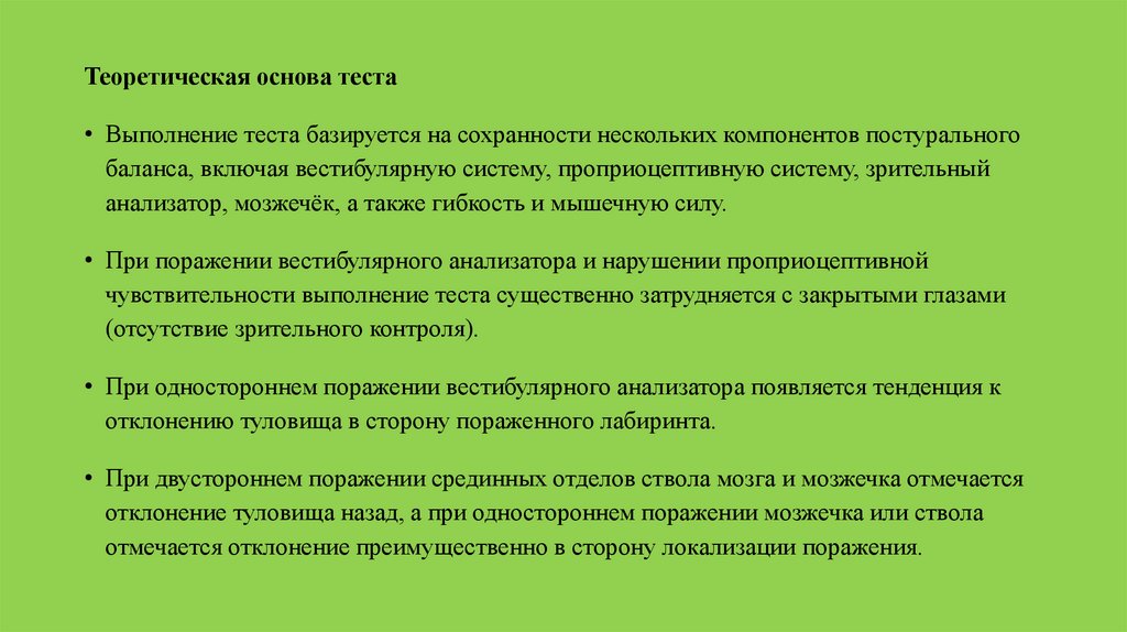 Теоретическая основа теста• Выполнение теста базируется на сохранности нескольких компонентов постурального