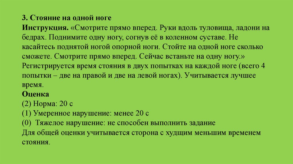 Разрешено 2 попытки. Измеряется время удержания пациентом позы до максимума в 20 с. Измерение заканчивается если пациент