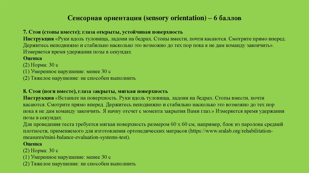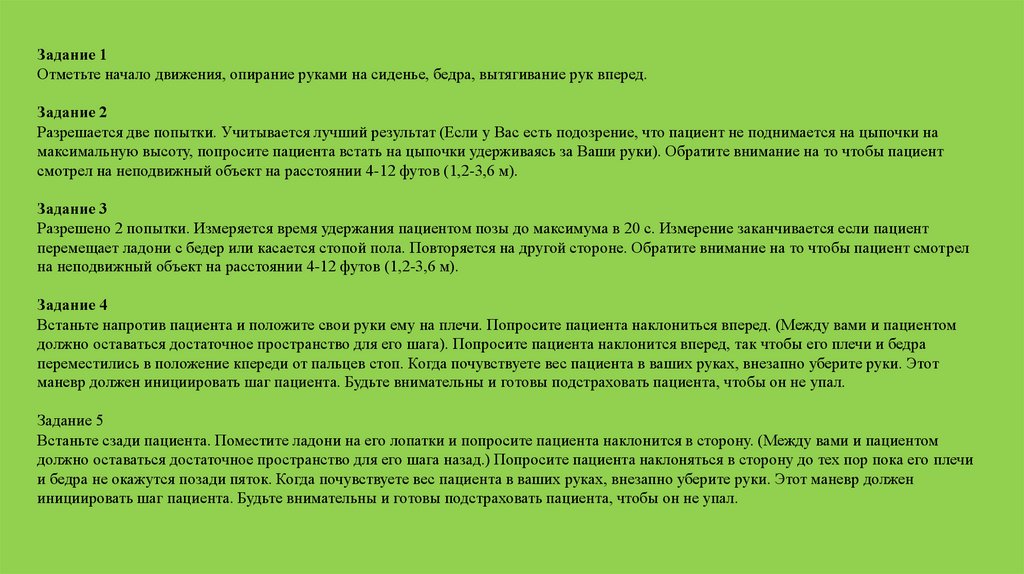 • Если пациент нуждается во вспомогательном средстве (трость, костыль и т.п.) для выполнения задания, это