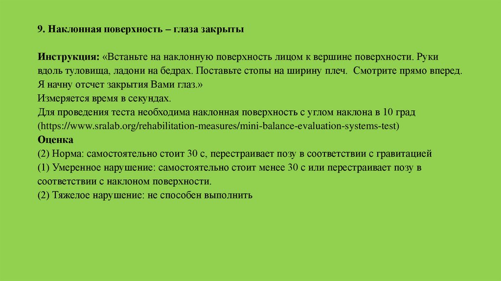 наклонная твердая поверхность (10 град); секундомер; отмеренная трехметровая дистанция для ходьбы.
