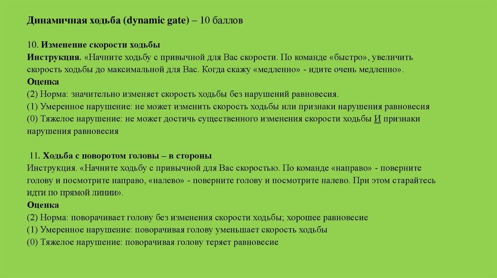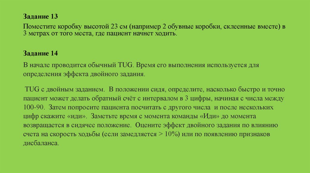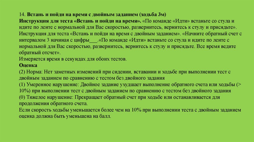 • Для задания 14 если скорость ходьбы уменьшается более чем на 10% при выполнении теста с двойным