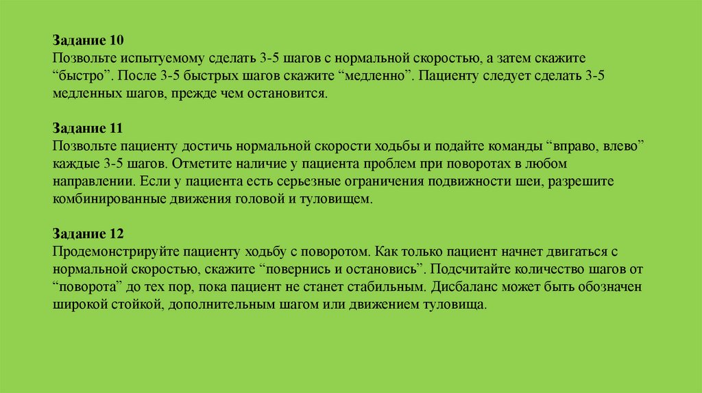 Задание 10Позвольте испытуемому сделать 3-5 шагов с нормальной скоростью, а затем скажите