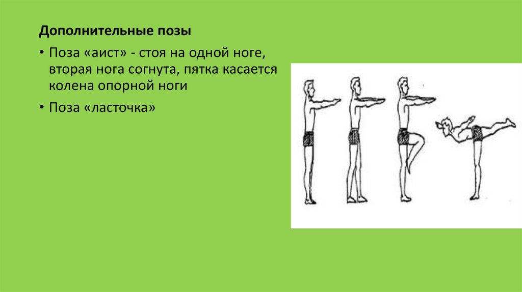 Дополнительные позы• Поза «аист» - стоя на одной ноге,