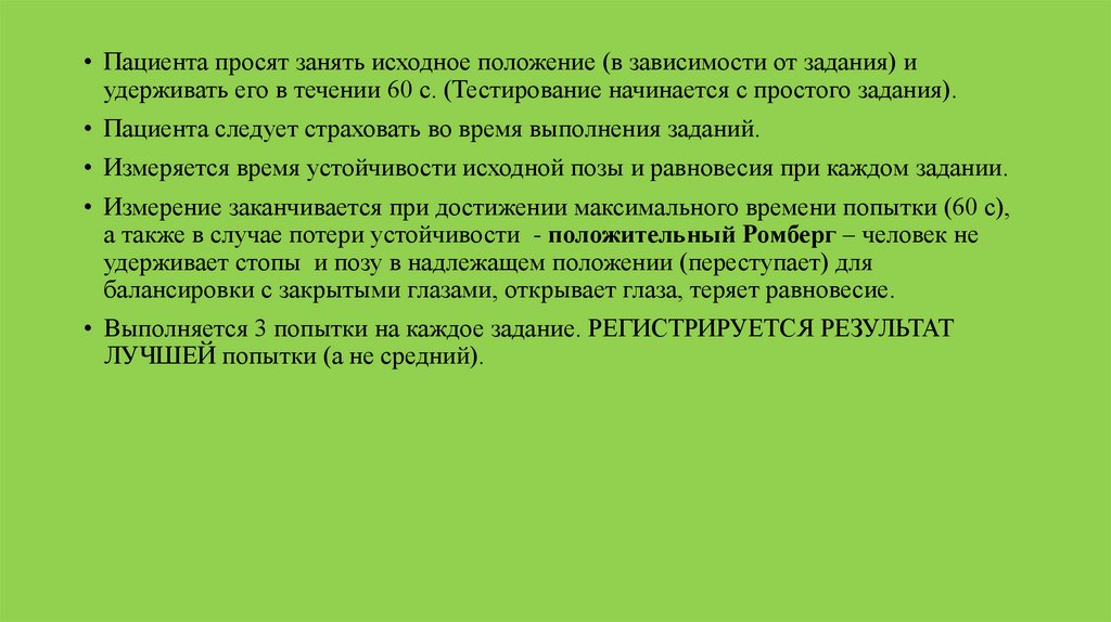 • Пациента просят занять исходное положение (в зависимости от задания) иудерживать его в течении 60 с. (Тестирование начинается с простого задания).