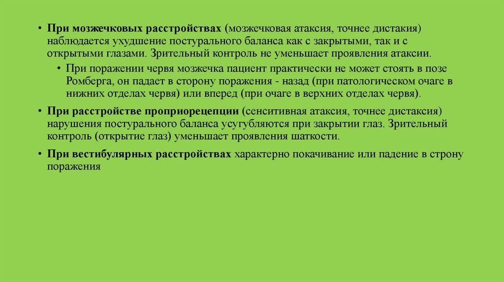 • При мозжечковых расстройствах (мозжечковая атаксия, точнее дистакия)наблюдается ухудшение постурального баланса как с закрытыми, так и с