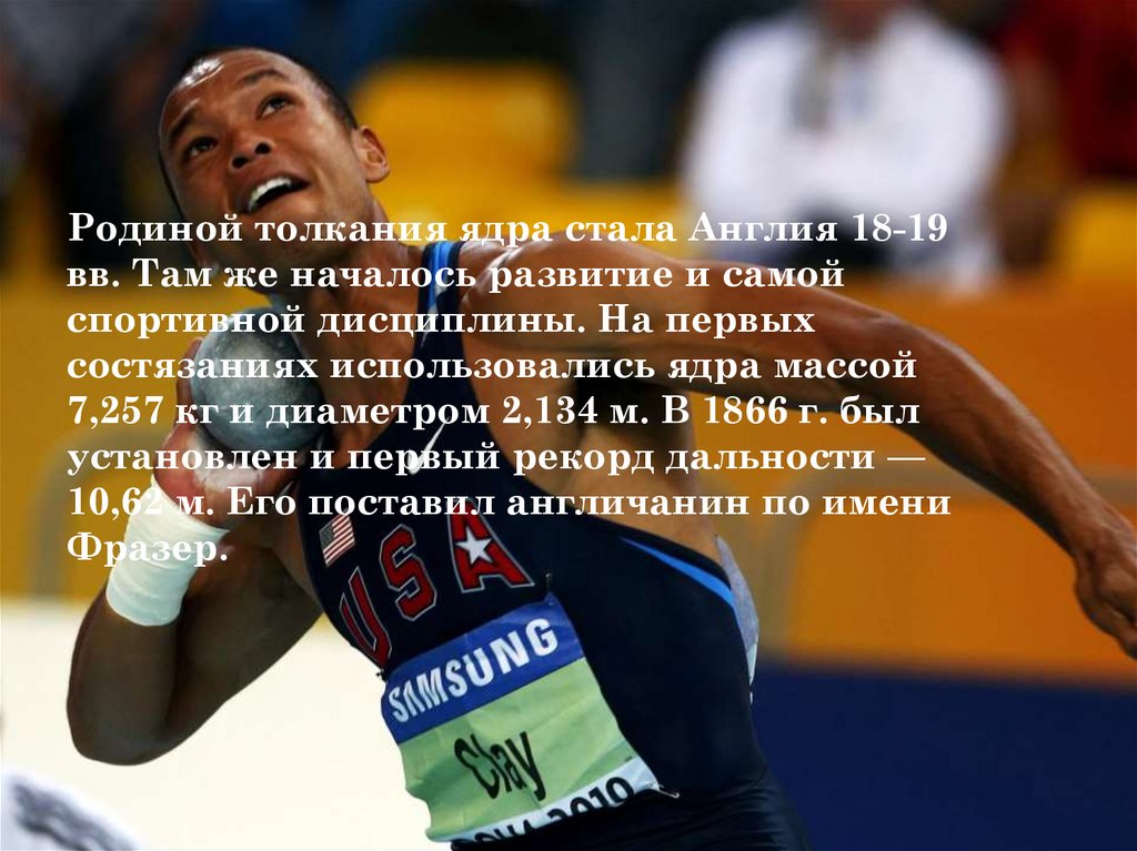 Родиной толкания ядра стала Англия 18-19вв. Там же началось развитие и самой