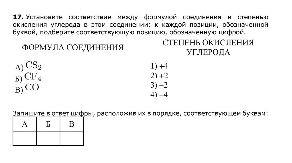17. Установите соответствие между формулой соединения и степеньюокисления углерода в этом соединении: к каждой позиции, обозначенной