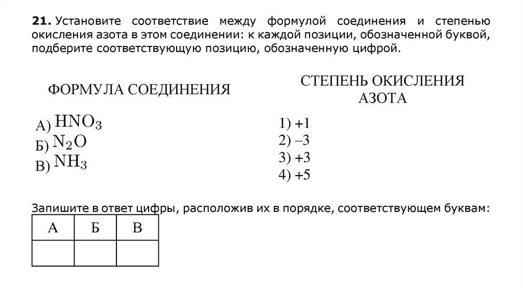 21. Установите соответствие между формулой соединения и степеньюокисления азота в этом соединении: к каждой позиции, обозначенной буквой,