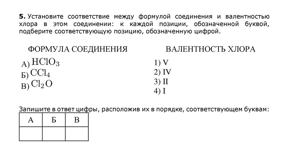 5. Установите соответствие между формулой соединения и валентностьюхлора в этом соединении: к каждой позиции, обозначенной буквой,