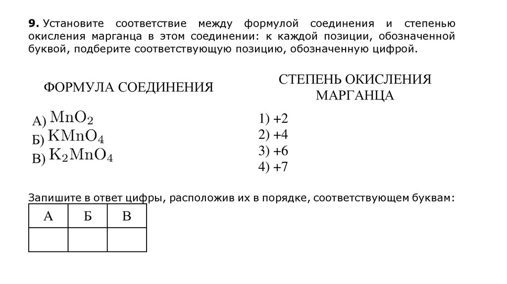 9. Установите соответствие между формулой соединения и степеньюокисления марганца в этом соединении: к каждой позиции, обозначенной