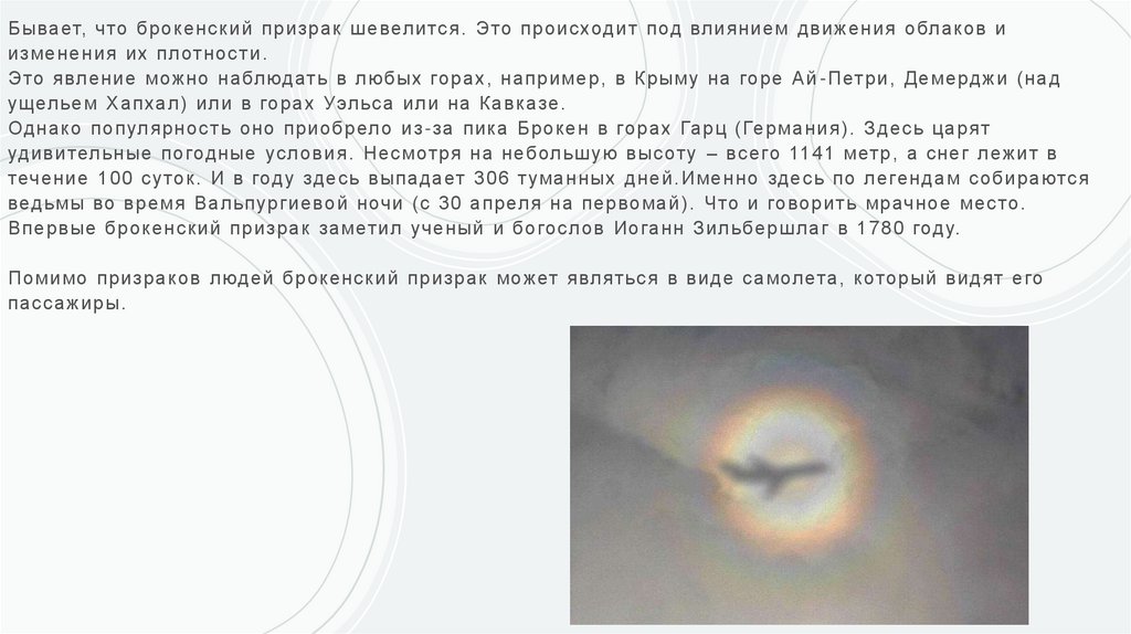 Бывает, что брокенс кий призрак шевелится. Это происход и т под влиянием движения облаков иизменения их пл относ ти .