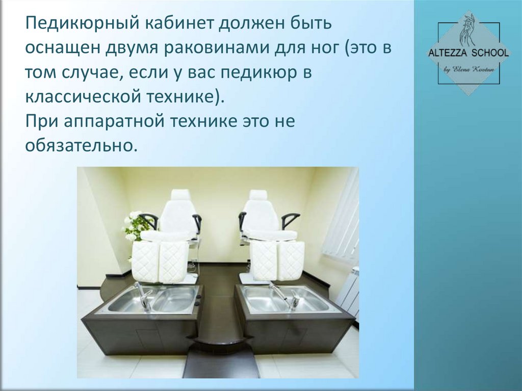 Педикюрный кабинет должен бытьоснащен двумя раковинами для ног (это в