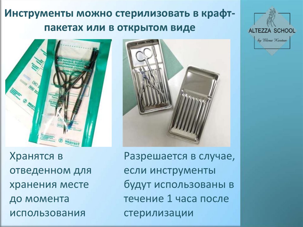 Инструменты можно стерилизовать в крафтпакетах или в открытом видеХранятся в