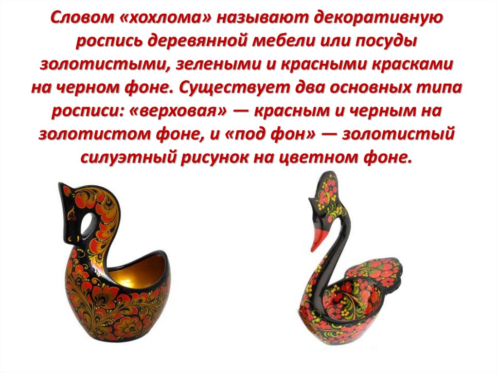 Словом «хохлома» называют декоративнуюроспись деревянной мебели или посуды