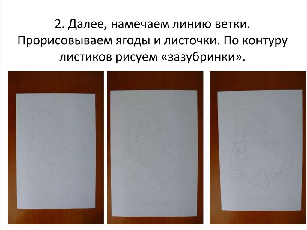 2. Далее, намечаем линию ветки.Прорисовываем ягоды и листочки. По контуру