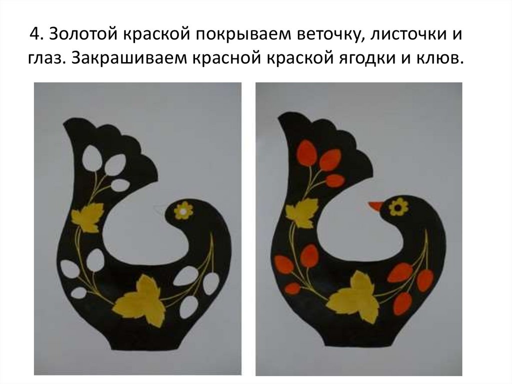 4. Золотой краской покрываем веточку, листочки иглаз. Закрашиваем красной краской ягодки и клюв.