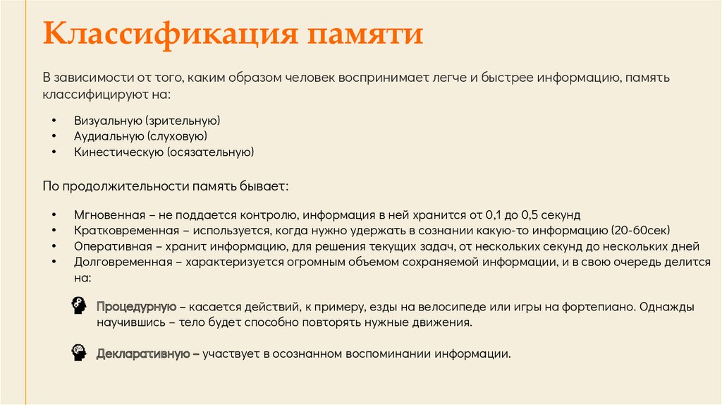 Классификация памятиВ зависимости от того, каким образом человек воспринимает легче и быстрее информацию, память